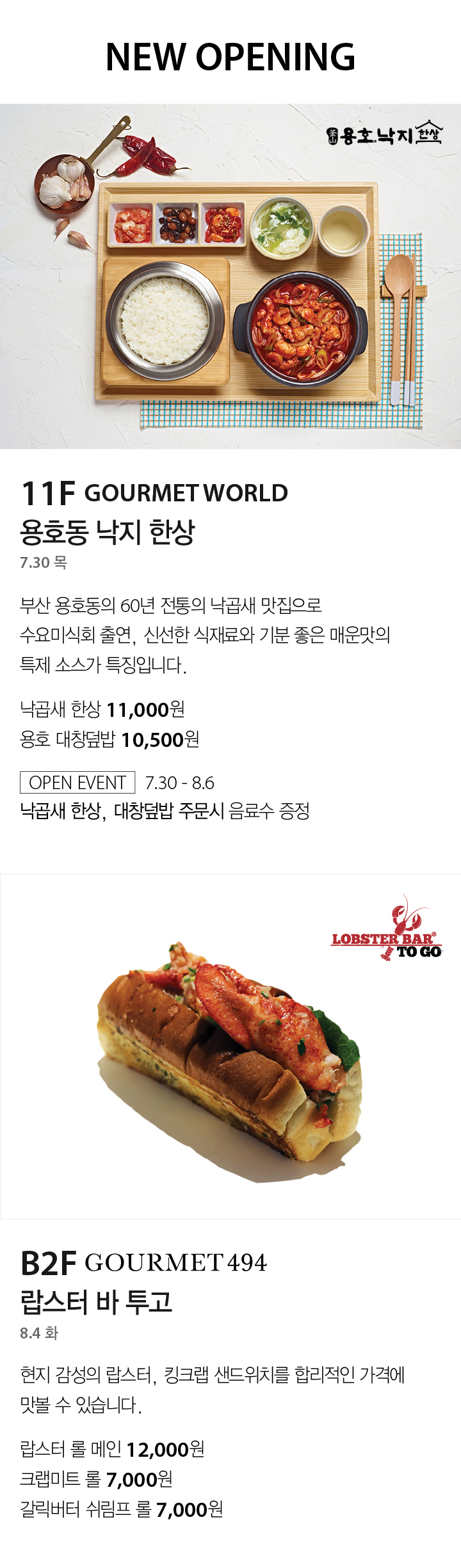 뉴오프닝&팝업 [NEW OPENING] 용호동 낙지 한상 ・ 랍스터 바 투고 11F, B2F 페이스북에 공유하기 카카오스토리로 공유하기 PREV 목록 NEXT 설 선물세트 예약 판매는 아래 번호로 문의 부탁드립니다. 타임월드 042.480.5587 확인