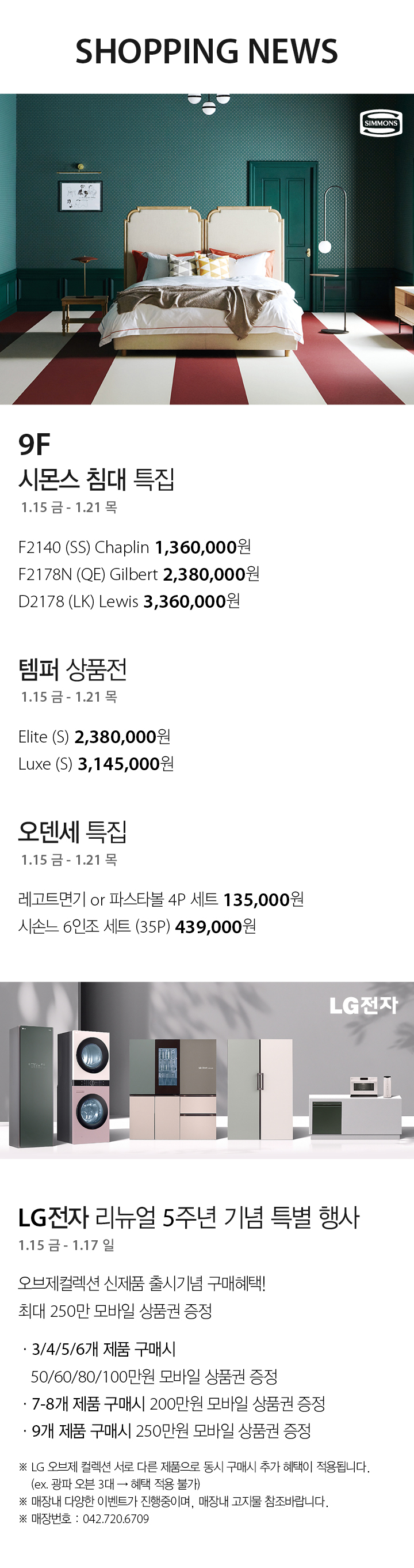 상품행사 시몬스침대 ・ 템퍼 특집 外 1.15 - 1.21, 9F 페이스북에 공유하기 카카오스토리로 공유하기 PREV 목록 NEXT 설 선물세트 예약 판매는 아래 번호로 문의 부탁드립니다. 타임월드 042.480.5587 확인