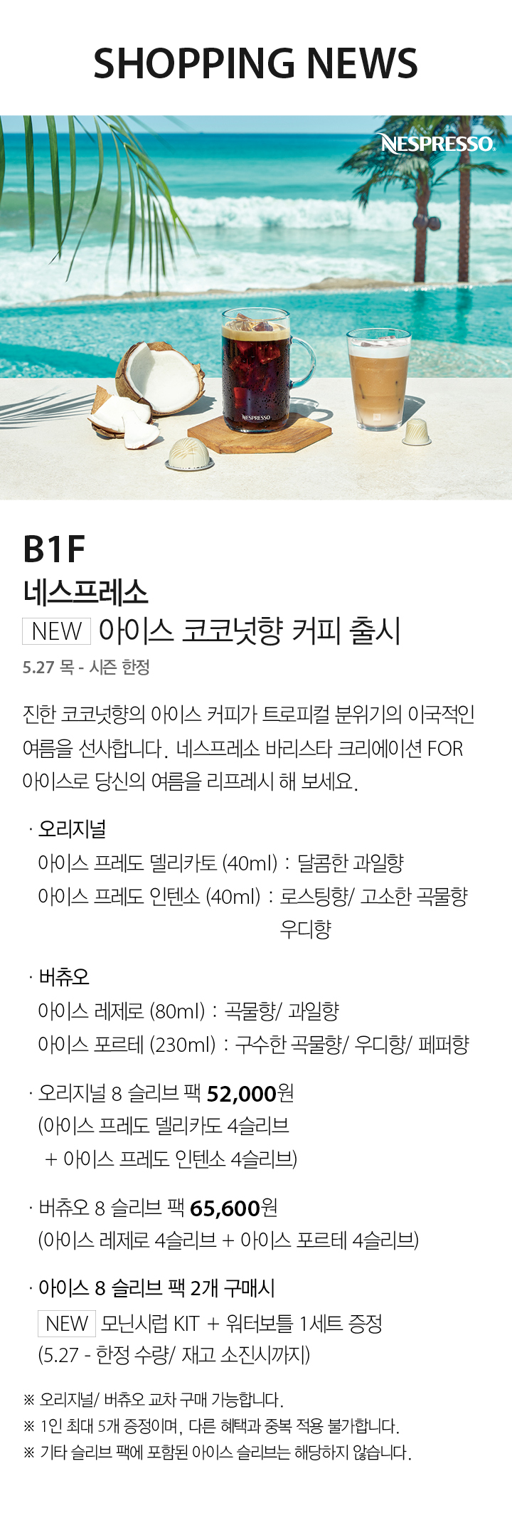상품행사 네스프레소 NEW 아이스 코코넛향 커피 출시 5.27 - , B1F 페이스북에 공유하기 카카오스토리로 공유하기 PREV 목록 NEXT 설 선물세트 예약 판매는 아래 번호로 문의 부탁드립니다. 타임월드 042.480.5587 확인