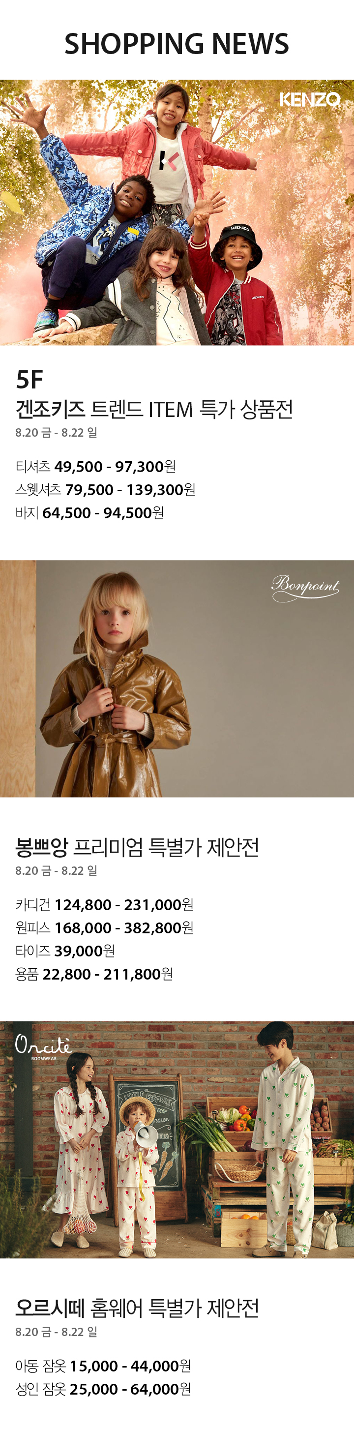 상품행사 겐조키즈 트렌드 아이템 특가 상품전 外 8.20 - 8.22, 5F 페이스북에 공유하기 카카오스토리로 공유하기 PREV 목록 NEXT 설 선물세트 예약 판매는 아래 번호로 문의 부탁드립니다. 타임월드 042.480.5587 확인
