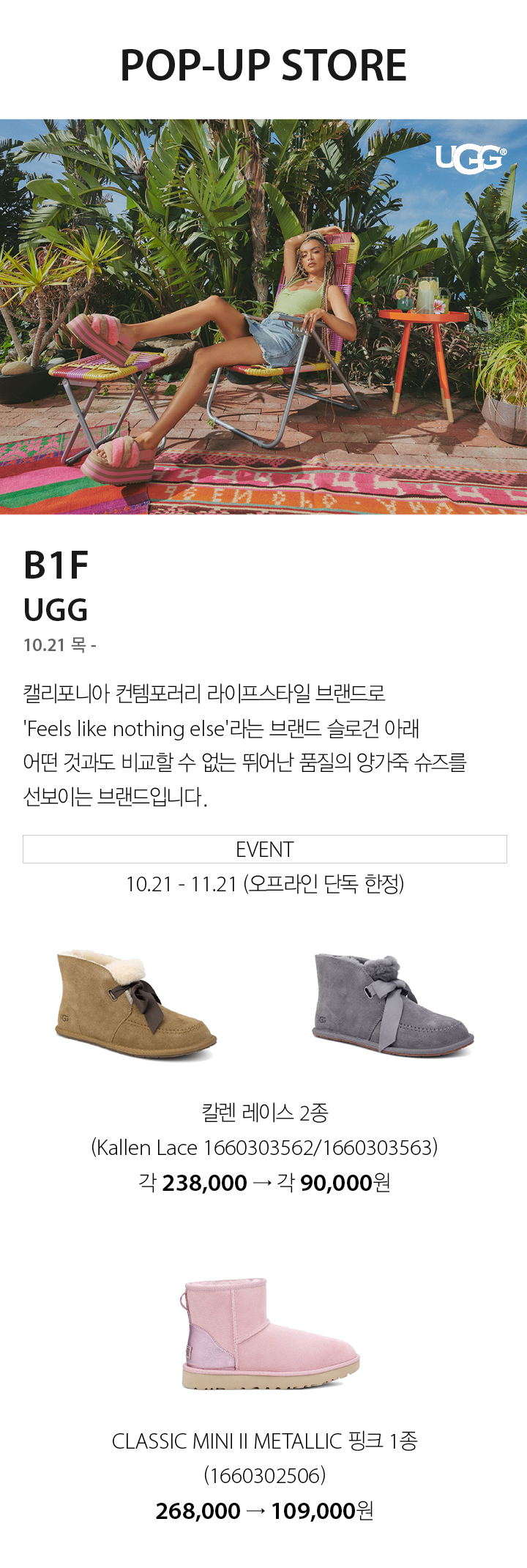 뉴오프닝&팝업 [POP-UP] UGG 10.21 - , B1F 페이스북에 공유하기 카카오스토리로 공유하기 PREV 목록 NEXT 설 선물세트 예약 판매는 아래 번호로 문의 부탁드립니다. 타임월드 042.480.5587 확인