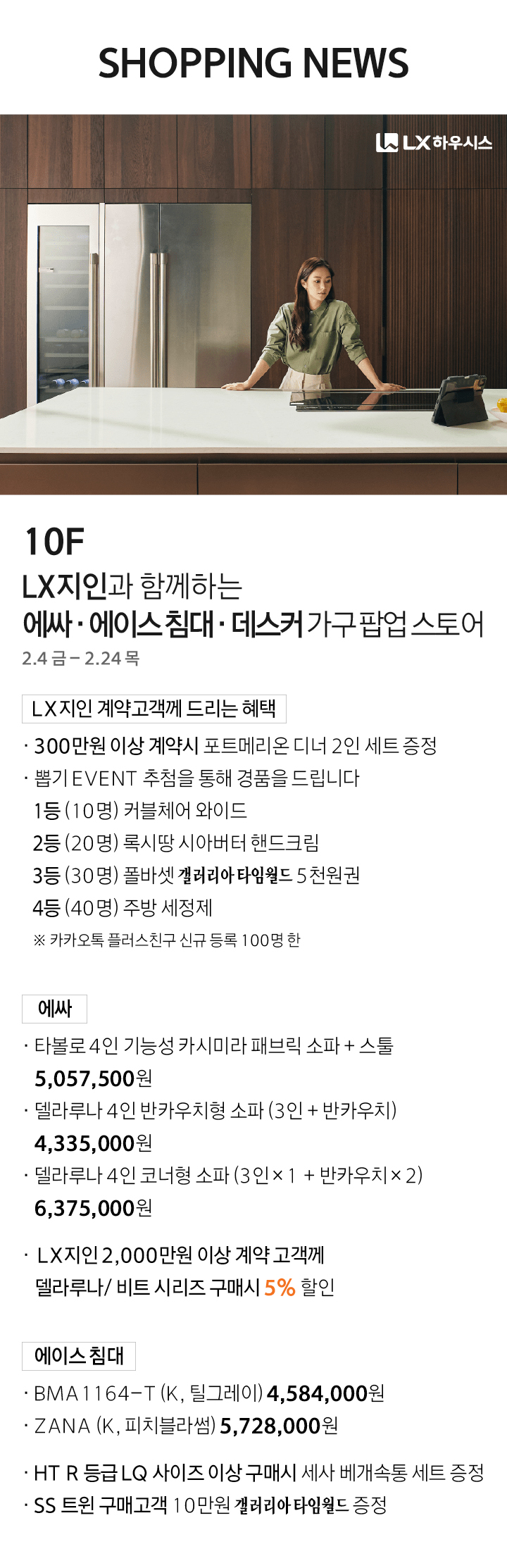 상품행사 LX지인과 함께하는 가구 팝업 스토어 2.4 - 2.24, 10F 페이스북에 공유하기 카카오스토리로 공유하기 PREV 목록 NEXT 설 선물세트 예약 판매는 아래 번호로 문의 부탁드립니다. 타임월드 042.480.5587 확인