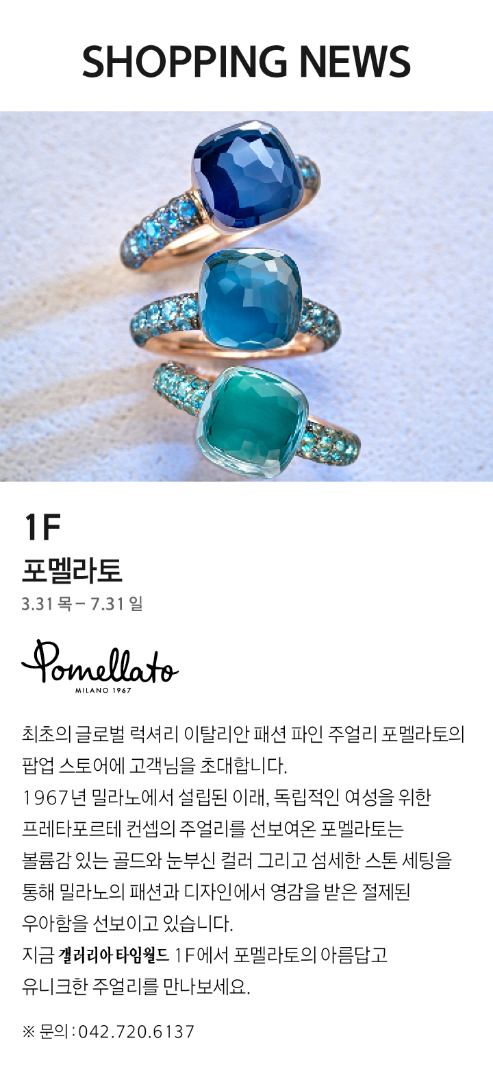 뉴오프닝&팝업 [POP-UP STORE] 포멜라토 3.31 - 7.31, 1F 페이스북에 공유하기 카카오스토리로 공유하기 PREV 목록 NEXT 설 선물세트 예약 판매는 아래 번호로 문의 부탁드립니다. 타임월드 042.480.5587 확인