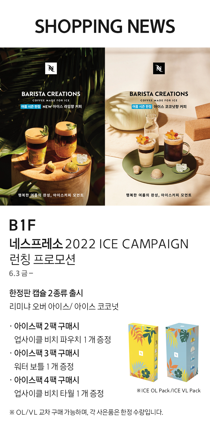 상품행사 네스프레소 2022 ICE CAMPAIGN 런칭 프로모션 B1F 페이스북에 공유하기 카카오스토리로 공유하기 PREV 목록 NEXT 설 선물세트 예약 판매는 아래 번호로 문의 부탁드립니다. 타임월드 042.480.5587 확인
