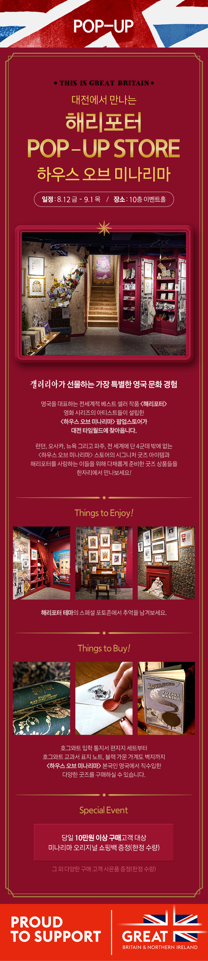 뉴오프닝&팝업 [THIS IS GREAT BRITAIN] 대전에서 만나는 해리포터 <하우스 오브 미나리마> 팝업스토어 8.12 - 9.1, 10F 이벤트홀 페이스북에 공유하기 카카오스토리로 공유하기 PREV 목록 NEXT 설 선물세트 예약 판매는 아래 번호로 문의 부탁드립니다. 타임월드 042.480.5587 확인