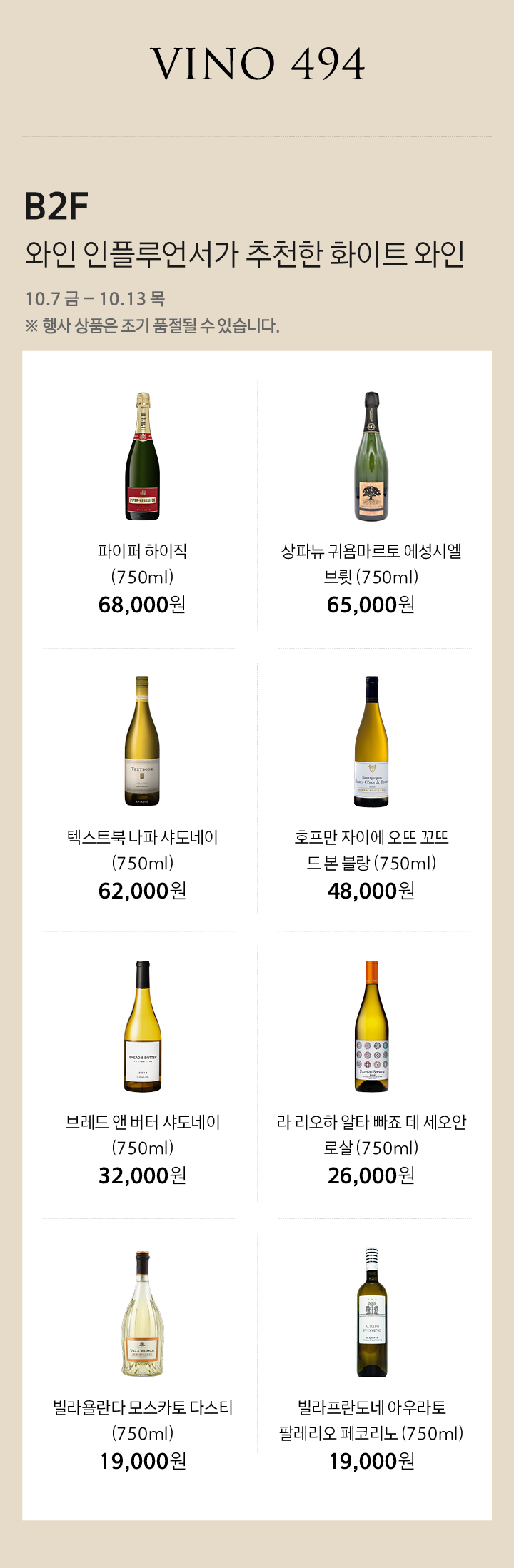 상품행사 [VINO 494] 와인 인플루언서가 추천한 화이트 와인 10.7 - 10.13, B2F VINO 494 페이스북에 공유하기 카카오스토리로 공유하기 PREV 목록 NEXT 설 선물세트 예약 판매는 아래 번호로 문의 부탁드립니다. 타임월드 042.480.5587 확인
