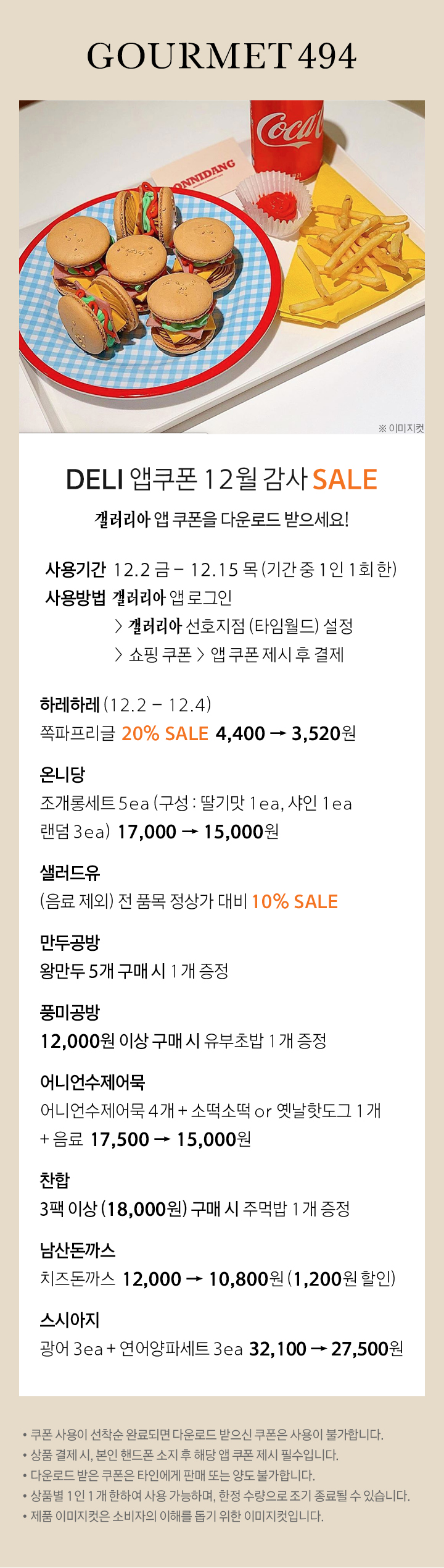 상품행사 [GOURMET 494] DELI 앱쿠폰 12월 감사 SALE B2F GOURMET 494 페이스북에 공유하기 카카오스토리로 공유하기 PREV 목록 NEXT 설 선물세트 예약 판매는 아래 번호로 문의 부탁드립니다. 타임월드 042.480.5587 확인