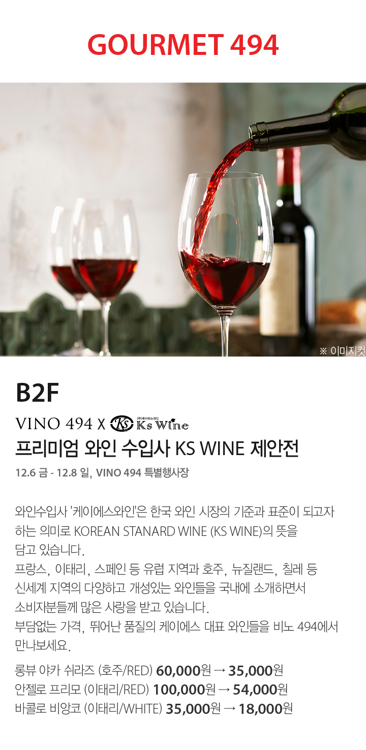 상품행사 GOURMET 494 비노 494 X KS WINE B2F GOURMET 494 페이스북에 공유하기 카카오스토리로 공유하기 PREV 목록 NEXT 설 선물세트 예약 판매는 아래 번호로 문의 부탁드립니다. 타임월드 042.480.5587 확인