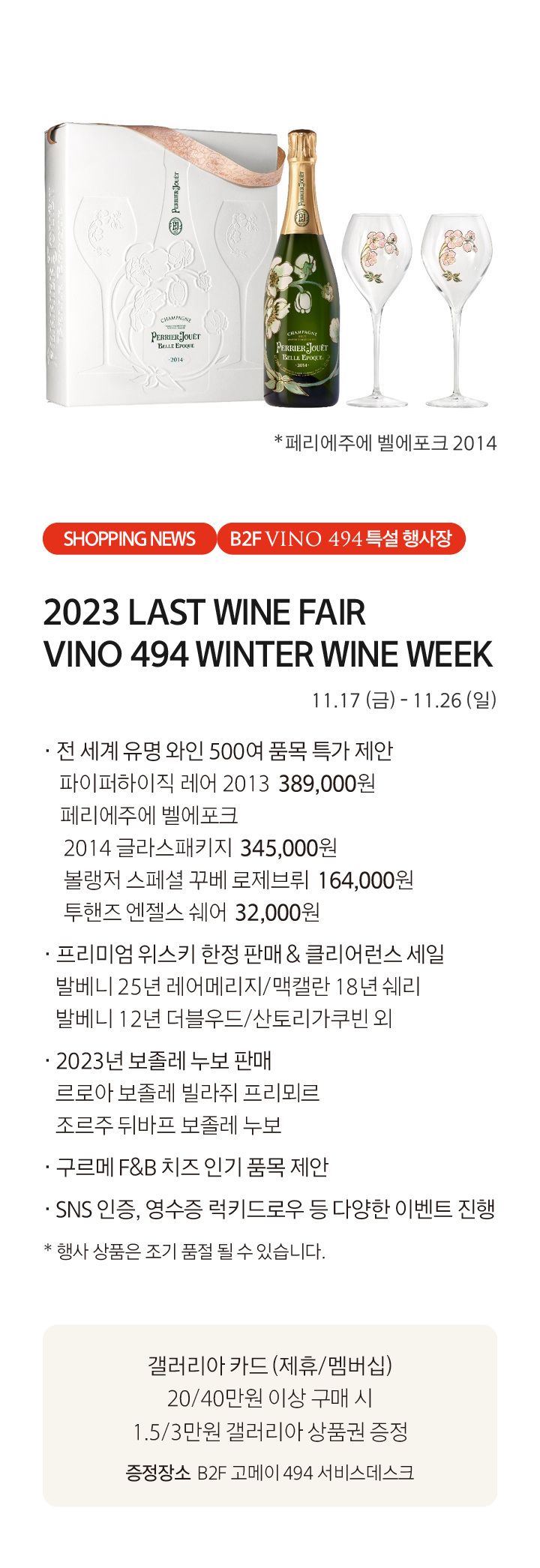 상품행사 2023 LAST WINE FAIR 11.17 - 11.26, B2F VINO 494 페이스북에 공유하기 카카오스토리로 공유하기 PREV 목록 NEXT 설 선물세트 예약 판매는 아래 번호로 문의 부탁드립니다. 타임월드 042.480.5587 확인