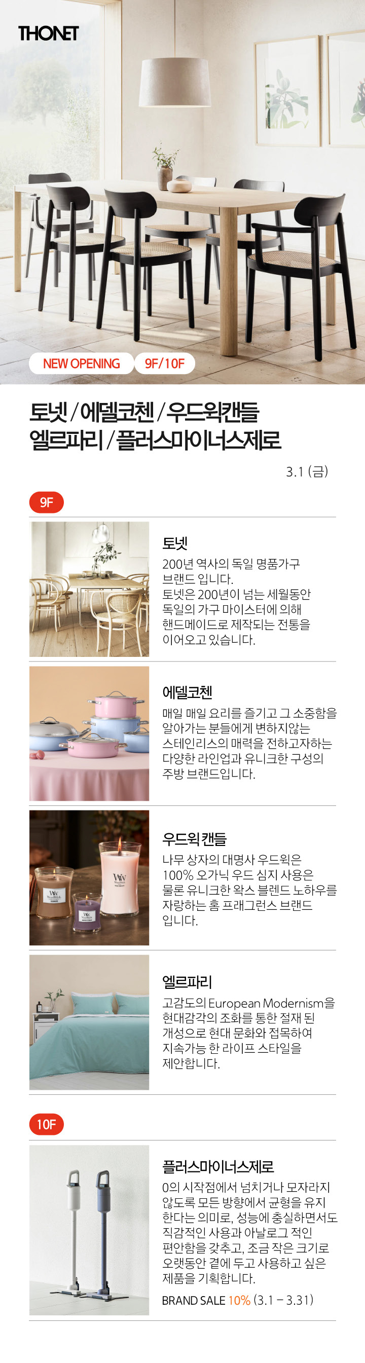 뉴오프닝&팝업 NEW OPENING 토넷/에델코첸/우드윅캔들/엘르파리/플러스마이너스제로 9F/10F 페이스북에 공유하기 카카오스토리로 공유하기 PREV 목록 NEXT 설 선물세트 예약 판매는 아래 번호로 문의 부탁드립니다. 타임월드 042.480.5587 확인