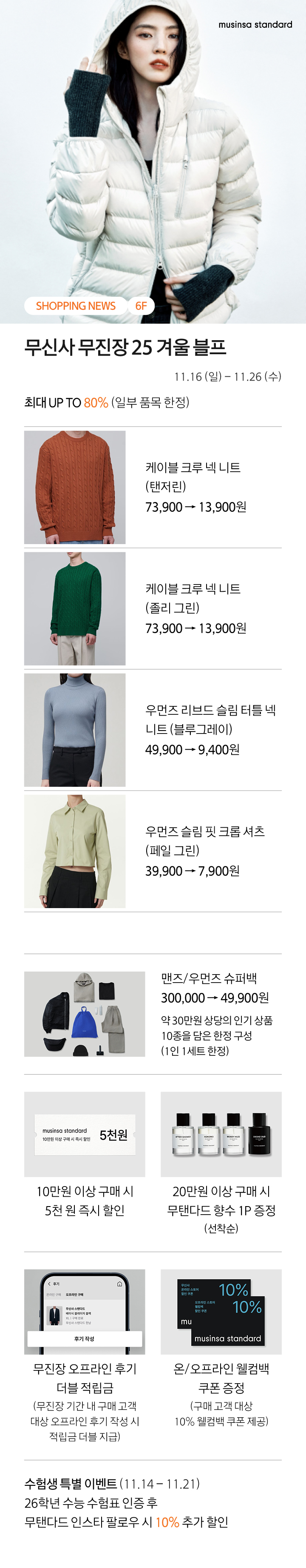 상품행사 무신사 무진장 25 겨울 블프 6F 페이스북에 공유하기 카카오스토리로 공유하기 PREV 목록 NEXT 설 선물세트 예약 판매는 아래 번호로 문의 부탁드립니다. 타임월드 042.480.5587 확인