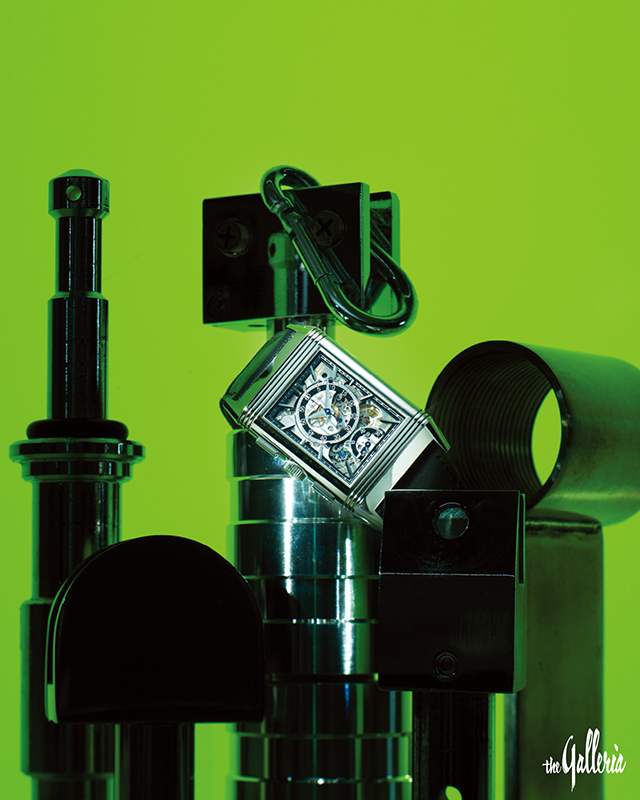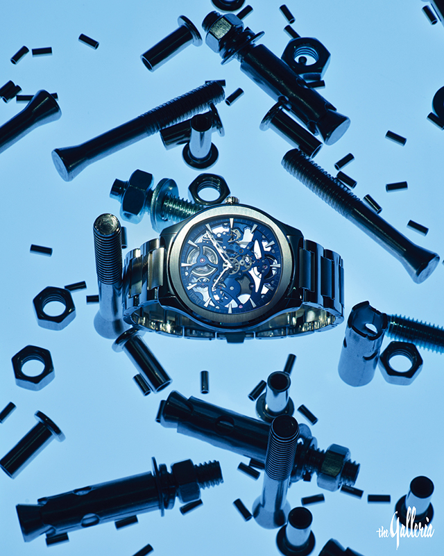 빛과 그림자가 만드는 강렬한 시너지에 드러난 스켈레톤 워치의 투명한 골격.