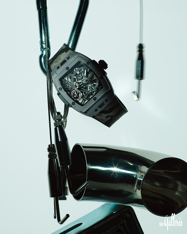 HUBLOT 마이크로 블라스트 및 폴리시드 처리한 그레이 세라믹 소재 케이스와 베젤, 패브릭 & 러버 스트랩으로 가벼운 무게감이 인상적인 스피릿 오브 빅뱅 투르비용 소라이.