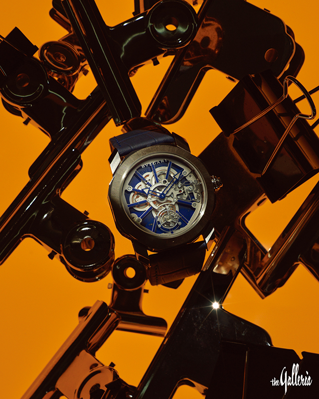 BVLGARI 직경 44mm의 화이트 골드 & 플래티넘 케이스에 무브먼트와 미들 케이스를 라피스라줄리로 장식한 스켈레톤 다이얼이 돋보이는 옥토 로마 투르비용 나투랄리아.