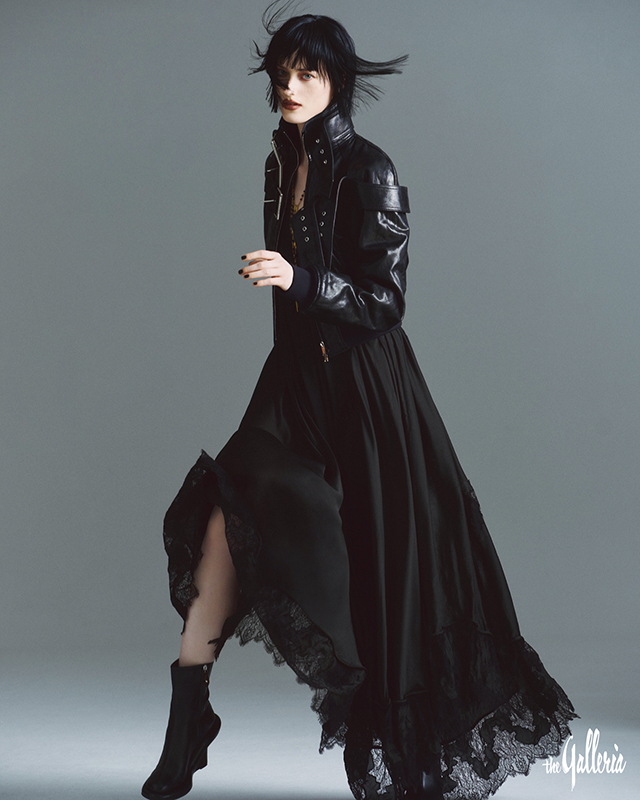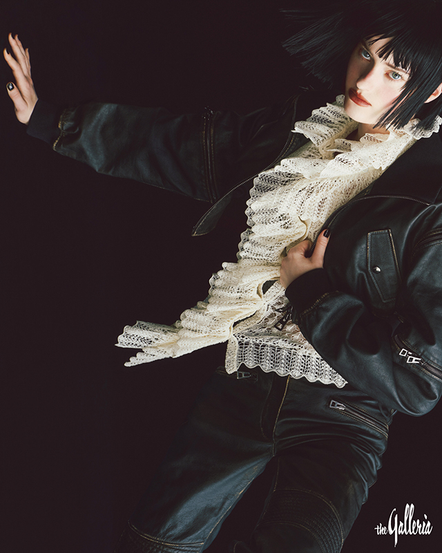 DIOR 바이커 스타일의 가죽 재킷과 버뮤다 쇼츠, 화려한 러플 장식의 레이스 블라우스.