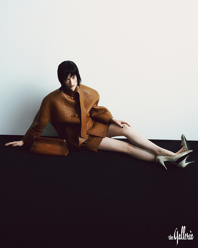 PRADA 나파 가죽 소재로 볼륨감 있는 실루엣을 완성한 재킷과 스커트, 빈티지한 가죽과 커팅 디테일이 유니크한 펌프스, 미니멀한 디자인의 앙세네 백.
