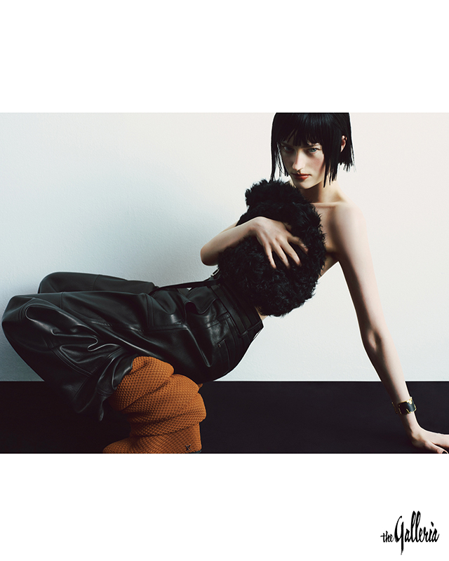 DOLCE & GABBANA 톱으로 활용한 퍼 소재 빅 해트. SPORTMAX 은은한 광택이 느껴지는 나파 가죽 소재 와이드 팬츠. LOUIS VUITTON 주름진 듯한 디자인의 웨지 부츠, 블랙 가죽과 골드 메탈을 매치한 커프.