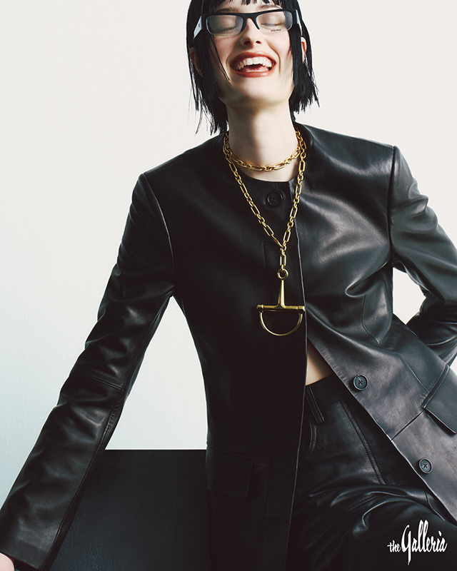 TOTEME 베이식한 디자인으로 두루 활용하기 좋은 칼라리스 가죽 재킷. JUUN.J 여유로운 실루엣의 쇼츠. MIU MIU 반무테 프레임과 볼드한 템플이 어우러진 아이웨어. GUCCI 시그니처 하프 홀스빗 심볼로 포인트를 준 네크리스.