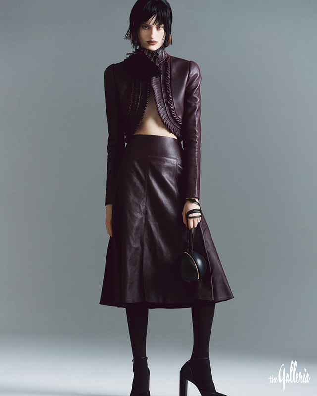ALAIA 플리츠 디테일을 가미한 과감한 디자인의 하이넥 양가죽 재킷과 슬릿 스커트, 플라워 모티브의 넥 장식, 스퀘어 토 앵클 스트랩 슈즈, 블랙 스타킹, 원형 셰이프의 스몰 숄더 스피어 백, 볼드한 골드 메탈 이어링.