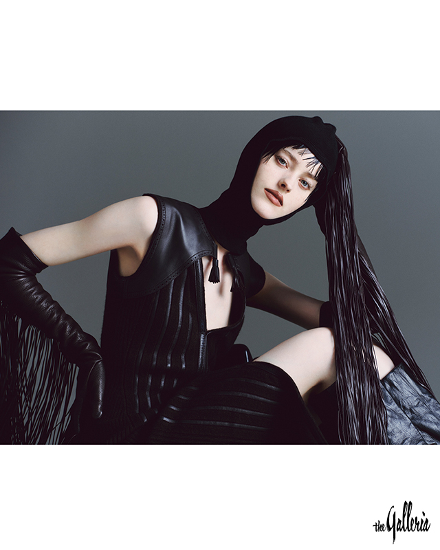 HERMÈS 캐시미어와 가죽 소재로 완성한 미디드레스. SPORTMAX 길게 늘어진 프린지 장식이 드라마틱한 글러브. VALENTINO GARAVANI 얼굴을 부드럽게 감싸는 저지 소재 발라클라바. DOLCE & GABBANA 와일드한 디자인의 롱부츠.