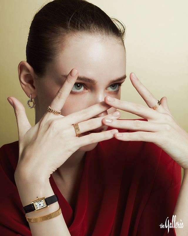CARTIER (왼쪽부터 시계 방향) 화이트 와 옐로, 핑크 골드가 조화를 이룬 다이아몬드 세팅 장식의 트리니티 이어링, 오른손 검지에 착용한 옐로 골드 소재의 스몰 클래쉬 드 까르띠에 링, 약지의 옐로 골드 소재 LOVE 언리미티드 링, 왼손 검지에 낀 옐로 골드 소재 클래식 LOVE 링, 옐로 골드 케이스에 실버 마감 그레인 다이얼과 샤이니 블랙 악어가죽 스트랩을 매치한 탱크 루이 까르띠에 미니 워치, 함께 레이어링한 옐로 골드 소재 LOVE 언리미티드 브레이슬릿. 레드 드레스는 키톤 제품.