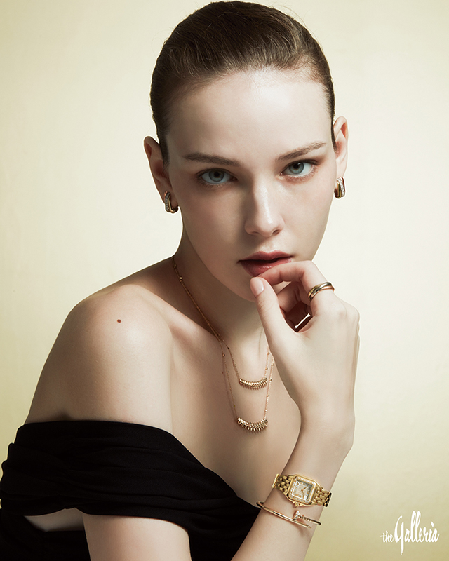 CARTIER (위부터 시계 방향) 옐로와 핑크, 화이트 골드 소재에 브릴리언트 컷 다이아몬드를 세팅한 트리니티 이어링, 오른손 검지에 낀 옐로와 핑크, 화이트 골드 소재의 트리니티 클래식 링, 브릴리언트 컷 다이아몬드를 세팅한 옐로 골드 케이스와 실버 마감 태양 광선 모티브 브러시드 다이얼, 옐로 골드 브레이슬릿으로 완성한 팬더 드 까르띠에 스몰 워치, 함께 레이어링한 핑크 골드와 브릴리언트 컷 다이아몬드가 어우러진 저스트 앵 끌루 스몰 브레이슬릿, 스몰과 미디엄 사이즈를 함께 연출한 옐로 골드 소재 클래쉬 드 까르띠에 네크리스. 블랙 톱은 YCH 제품.