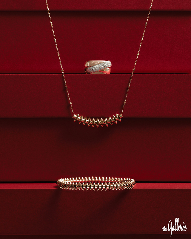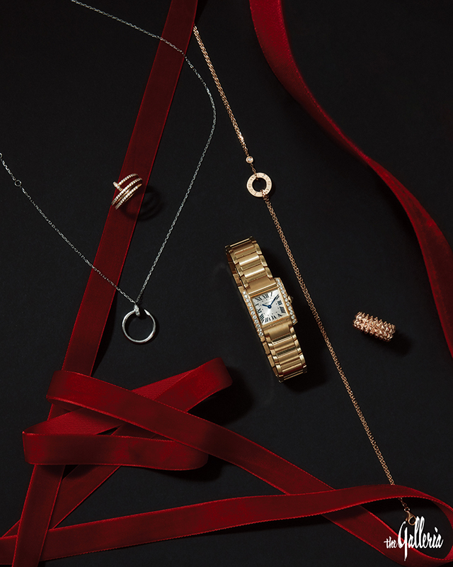 CARTIER (왼쪽 위부터 시계 방향) 핑크 골드에 브릴리언트 컷 다이아몬드를 세미 파베 세팅한 저스트 앵 끌루 링, 브릴리언트 컷 다이아몬드를 장식한 핑크 골드 소재 LOVE 네크리스, 핑크 골드 소재 클래쉬 드 까르띠에 링, 브릴리언트 컷 다이아몬드를 세팅한 옐로 골드 케이스와 골드 태양 광선 모티브 다이얼로 구성한 탱크 프랑세즈 스몰 워치, 화이트 골드에 브릴리언트 컷 다이아몬드를 매치한 저스트 앵 끌루 네크리스.