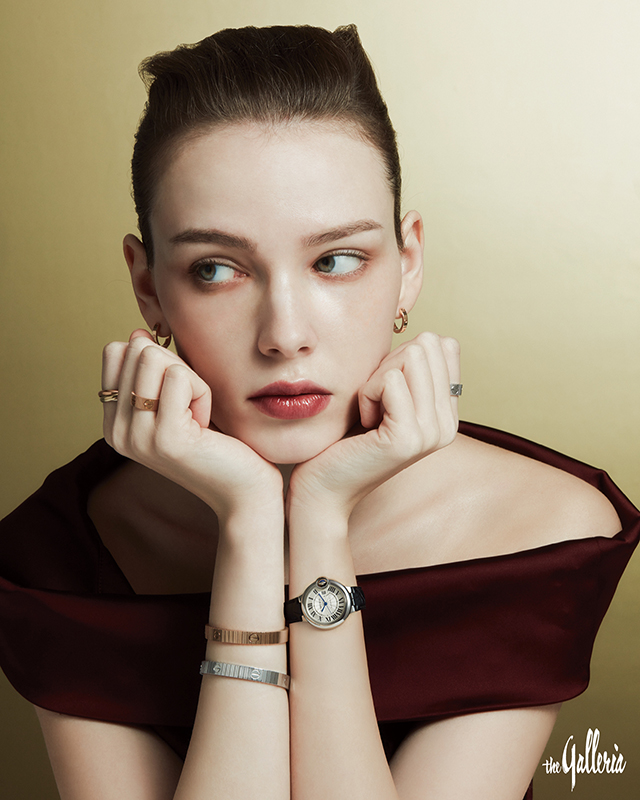 CARTIER (위부터 시계 방향) 핑크 골드 소재 LOVE 이어링, 왼손 검지에 착용한 화이트 골드 소재 LOVE 언리미티드 링, 직경 36mm의 스틸 케이스에 실버 기요셰 오팔린 다이얼과 오토매틱 와인딩 메커니컬 무브먼트를 탑재한 발롱 블루 드 까르띠에 워치, 오른손에 레이어링한 핑크 & 화이트 골드 소재 LOVE 언리미티드 브레이슬릿, 오른손 약지에 착용한 핑크 골드 소재 LOVE 언리미티드 링, 검지에 낀 화이트 & 옐로, 핑크 골드가 조화로운 트리니티 클래식 링. 버건디 컬러 드레스는 막스마라 제품.