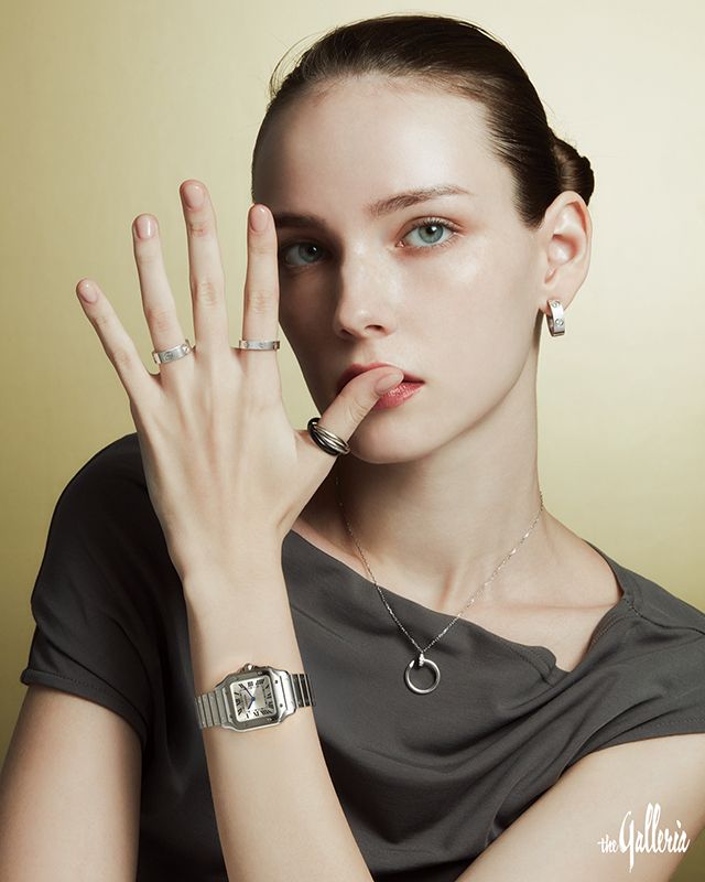 CARTIER (왼쪽부터 시계 방향) 왼손 약지와 검지에 클래식과 스몰 사이즈로 착용한 브릴리언트 컷 다이아몬드 세팅 장식의 LOVE 링, 엄지에 낀 블랙 세라믹과 화이트 골드 소재로 완성한 트리니티 클래식 링, 화이트 골드에 브릴리언트 컷 다이아몬드를 장식한 저스트 앵 끌루 네크리스, 화이트 골드에 브릴리언트 컷 다이아몬드를 세팅한 LOVE 클래식 이어링, 스틸 케이스에 실버 태양 광선 모티브 다이얼이 조화를 이룬 산토스 드 까르띠에 스몰 워치. 그레이 컬러 톱은 유돈초이 제품.