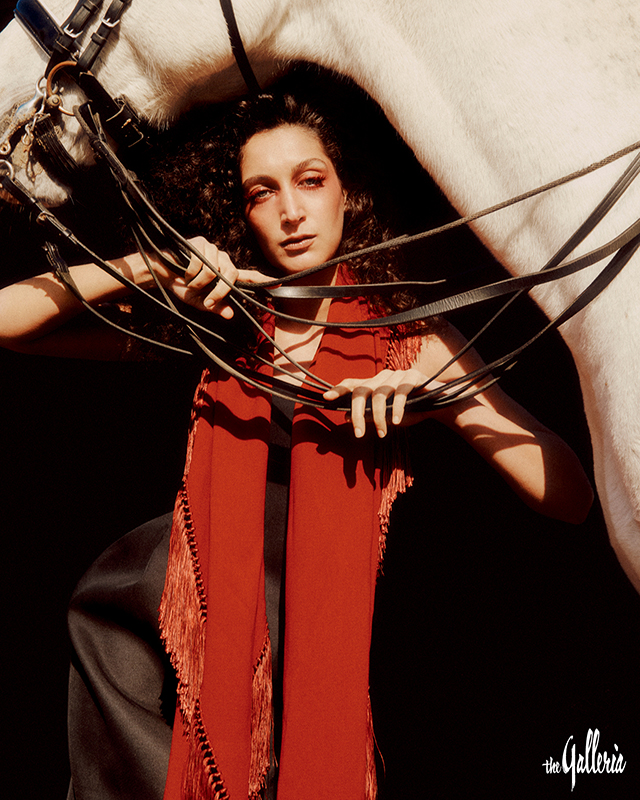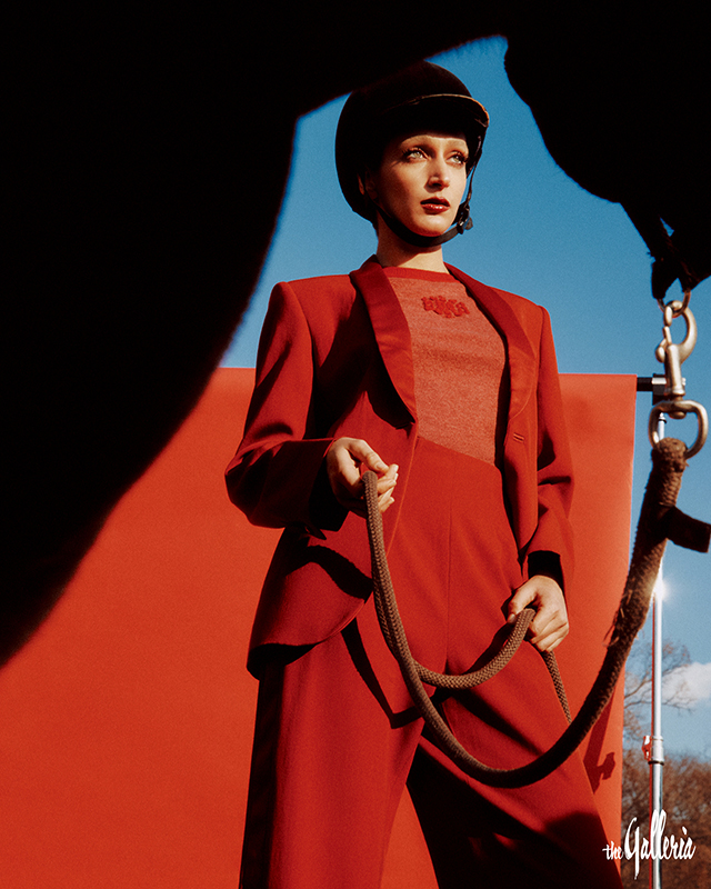VALENTINO 밑단의 로맨틱한 플라운스 디테일이 사랑스러운 미니드레스. Hermès 하이드로 카프스킨 소재로 제작한 라이딩 부츠. VALENTINO GARAVANI 쉐 발렌티노 디테일의 플로럴 라이크라 타이츠.