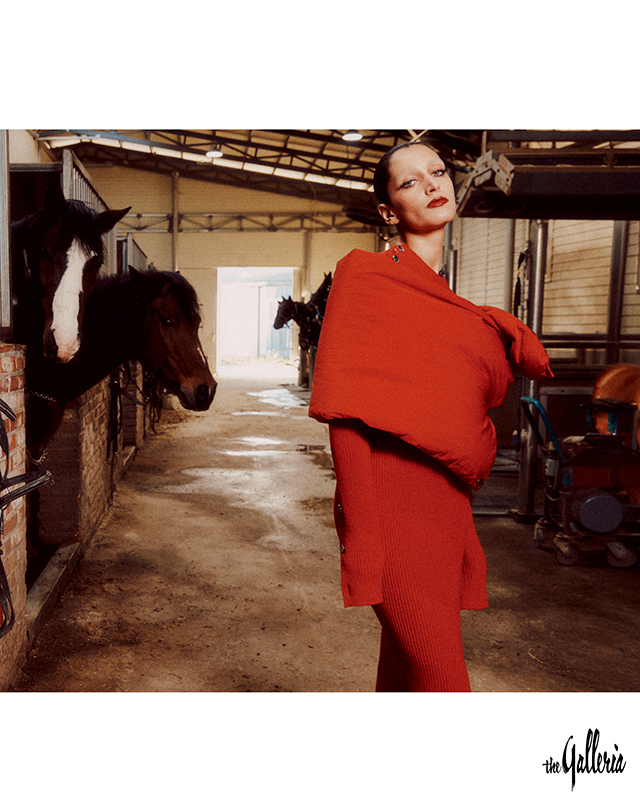 SPORTMAX 로고 프레스 스터드 장식이 특징인 패딩 숄과 함께 연출한 퓨어 울 니트 소재 슬림 피트 드레스.
