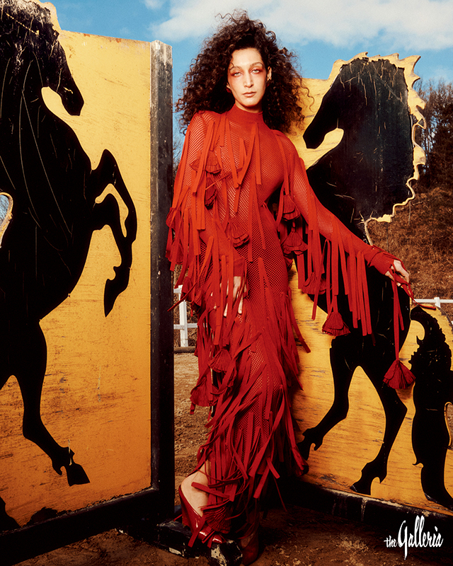 FERRAGAMO 프린지 장식으로 드라마틱한 효과를 준 메시 소재 드레스와 조각 형태의 오픈 토 뮬, 골드 메탈 스터드 이어링.