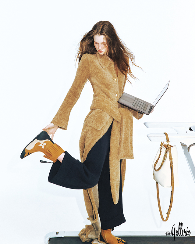 LOUIS VUITTON 부드러운 텍스처와 볼드한 벨트 디테일이 드라마틱한 코트, 와이드 팬츠, 보헤미안 무드의 태슬 장식 앵클부츠, 3개의 스트랩을 활용해 다양한 방식으로 연출할 수 있는 멀티패스 핸드백. -