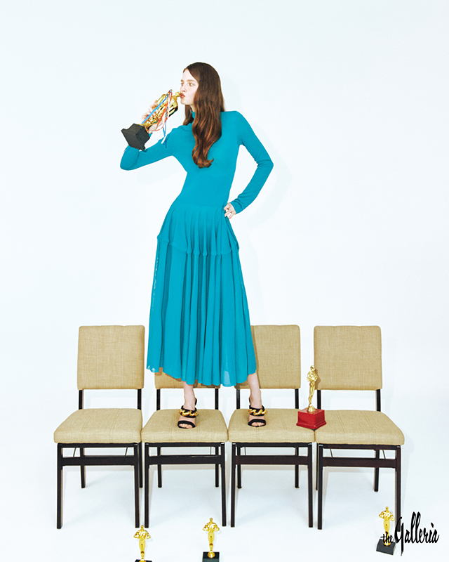 ALAIA 페플럼 스타일의 구조적인 셰이프가 인상적인 드레스, 볼드한 골드 체인 장식으로 포인트를 준 스웨이드 뮬. -
