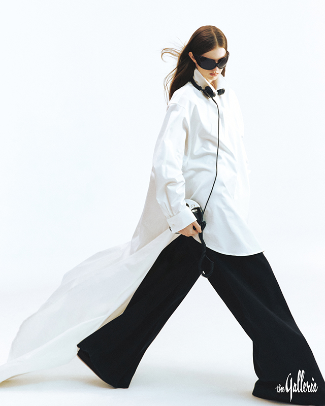 BALENCIAGA 길게 늘어뜨린 테일이 드라마틱한 셔츠, 루스한 팬츠, 얼굴을 감싸는 오버사이즈 선글라스. -