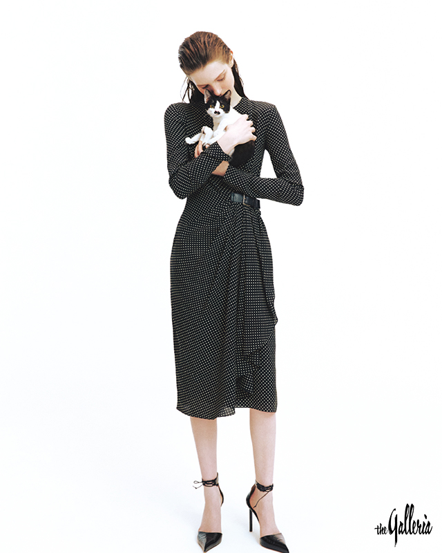 TOM FORD 도트 패턴과 벨트 장식으로 우아한 드레이프 디자인을 완성한 드레스, 스트랩으로 발목을 강조한 펌프스. -