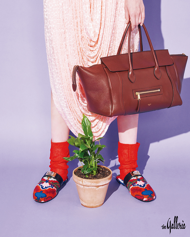 LOUIS VUITTON 독특한 플리츠 디테일의 드레스, 발등을 감싸는 버클 장식이 고급스러운 뮬, 강렬한 레드 레이스 삭스. CELINE 은은한 광택이 감도는 서플 샤이니 램스킨 소재의 미디엄 뉴 러기지 백.