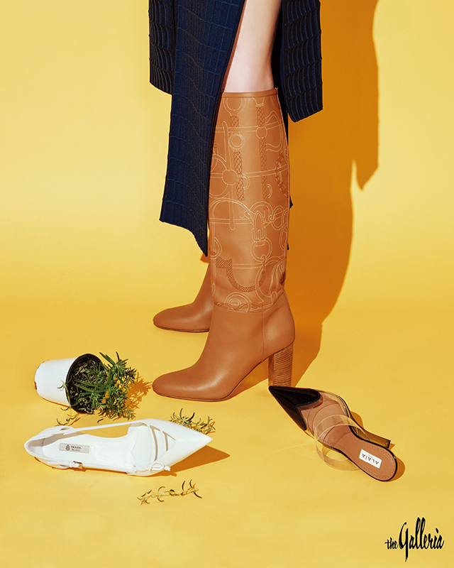 (위부터 시계 방향) HERMÈS 블루 실크 니트 소재 톱과 스커트, 섬세한 스티치 디테일로 기하학적 패턴을 완성한 미디 부츠. ALAIA 시그니처 하트 커팅이 돋보이는 웨지힐 뮬. PRADA 로맨틱한 보 장식이 시선을 사로잡는 펌프스.
