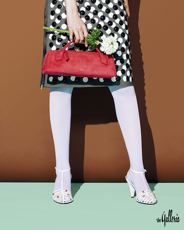 FENDI 블랙 & 화이트 폴카 도트 프라밀리언 장식을 수놓은 미디스커트. ALAIA 타이 장식의 쇼트 튜블러 핸들이 인상적인 클러치. CELINE 스트랩에 메탈 트리옹프 장식을 매치한 샌들. 바이올렛 컬러 타이츠는 에디터 소장품.