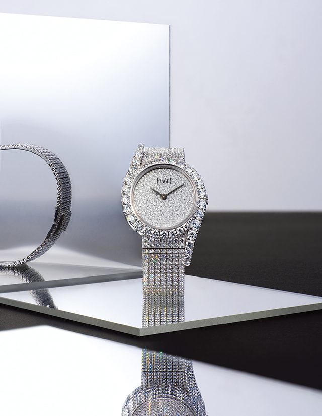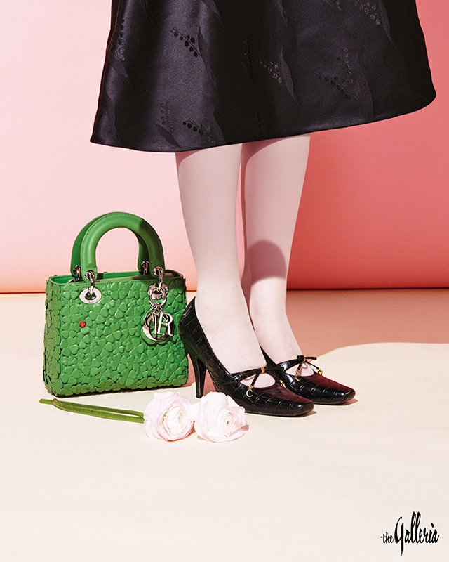 DIOR 릴리 오브 더 밸리 자카드 모티브의 미디스커트, 크로커다일 패턴의 카프스킨으로 완성한 블랙 펌프스, 아이코닉 디올 클로버 올오버 모티브 자수가 특징인 레이디 디올 백.