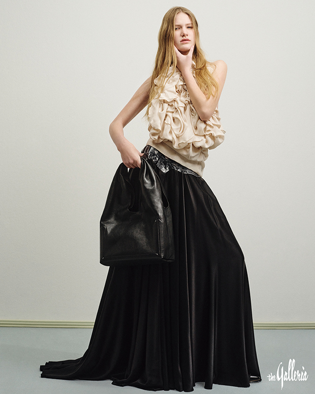 MAISON MARGIELA 모델이 착용한 플라워 러플 모티브의 실크 소재 톱과 테이프 디테일이 독특한 블랙 롱스커트, 양가죽 소재의 미디엄 사이즈 블랙 박스 백.