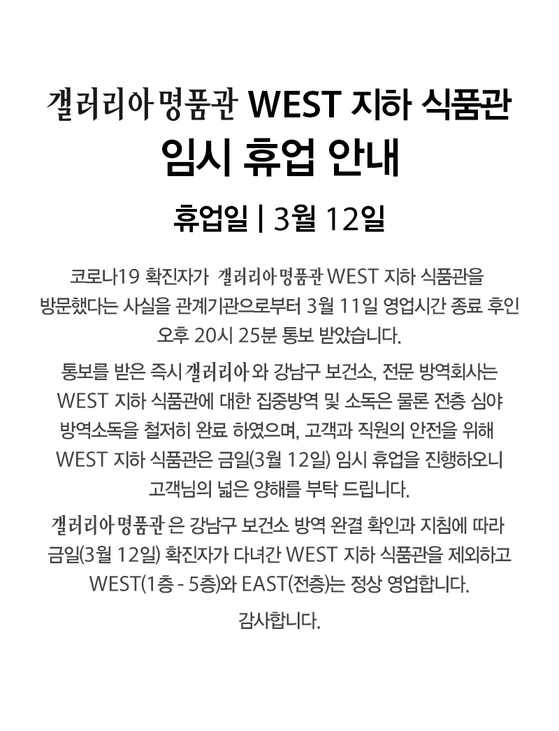 그 동안 갤러리아 수원점을 사랑해주신 고객님께 감사드립니다. 2020년 1월, 수원점은 영업종료 하였습니다. 2020년 2월 28일 오픈하는 갤러리아 광교에서 새로운 모습으로 뵙겠습니다. 감사합니다.